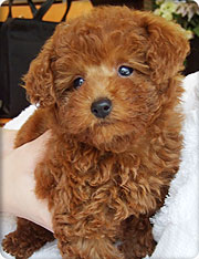 【18】K 様 プッチちゃん 父親はJKCチャンピオン(ケイヒンミモト様ご愛犬・キム)、母親もチャンピオンの直子という優良血統の女の子。きれいなレッドの毛並みに、くりっくりの大きな瞳と短いマズル。そしてとっても小振りなティーカップサイズのボディ。どこをとっても申し分のない、とびっきりの可愛らしさです。 |